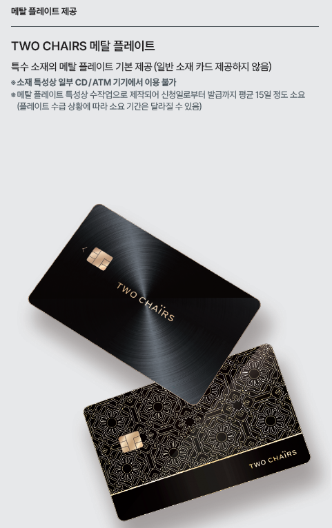 이는 우리카드가 고액 자산가를 겨냥해 지난해 11월 출시한 투 체어스 카드입니다. 우리금융 VIP 자산관리 서비스인 투 체어스 회원 중 최상위 등급인 블랙과 골드에 한해 발급 가능합니다. 투 체어스 블랙과 골드 회원은 반기 평균 잔액이 각각 50억원, 30억원 이상이어야 하는 등 가입 조건이 높습니다.