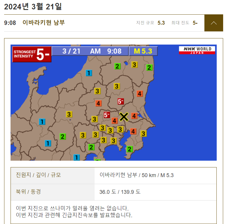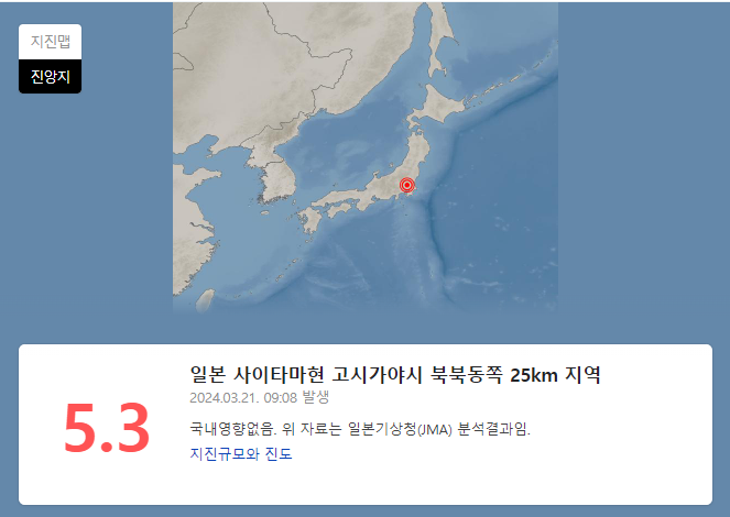 일본 지진 - 日 수도권서 규모 5.3 (24.03.21)