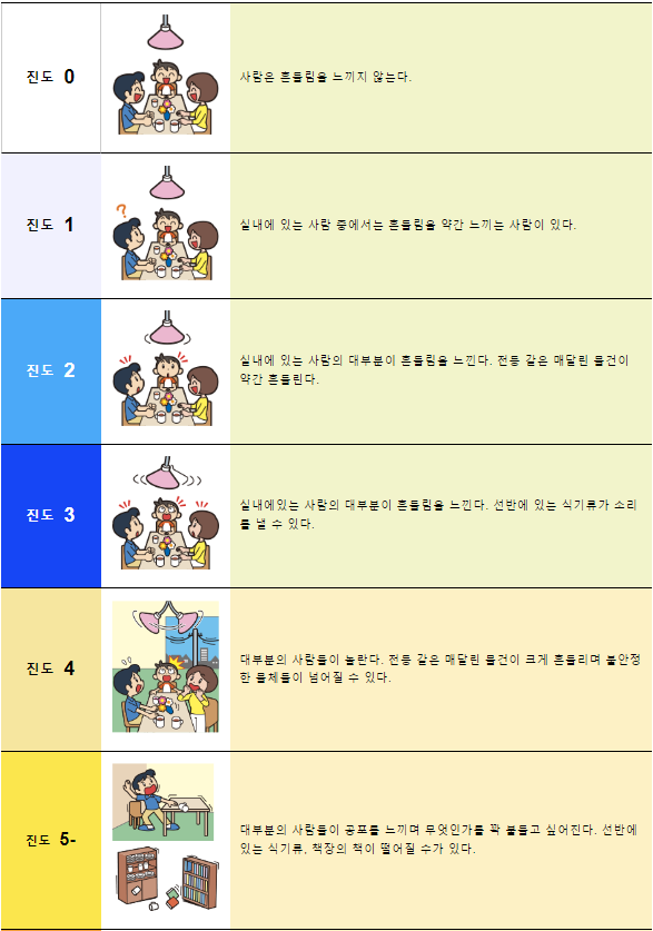 진도5약은 대부분 사람이 공포를 느끼며, 책상 위의 책 등이 떨어지거나 고정하지 않은 가구가 이동하고, 불안정한 물건이 쓰러지는 정도의 흔들림입니다.